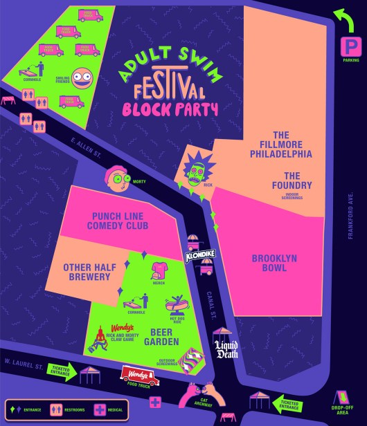 In addition to all the live entertainment the Adult Swim Festival will feature a full assortment of food and beverage options, ranging from local food trucks like Dre’s Water Ice & Ice Cream and Calle Del Sabor to Wendy’s, Klondike, and Liquid Death. But that’s not all, as the event will feature aptly named menu items that will no doubt appeal to the Adult Swim faithful, as well as some exlusive merch releases.